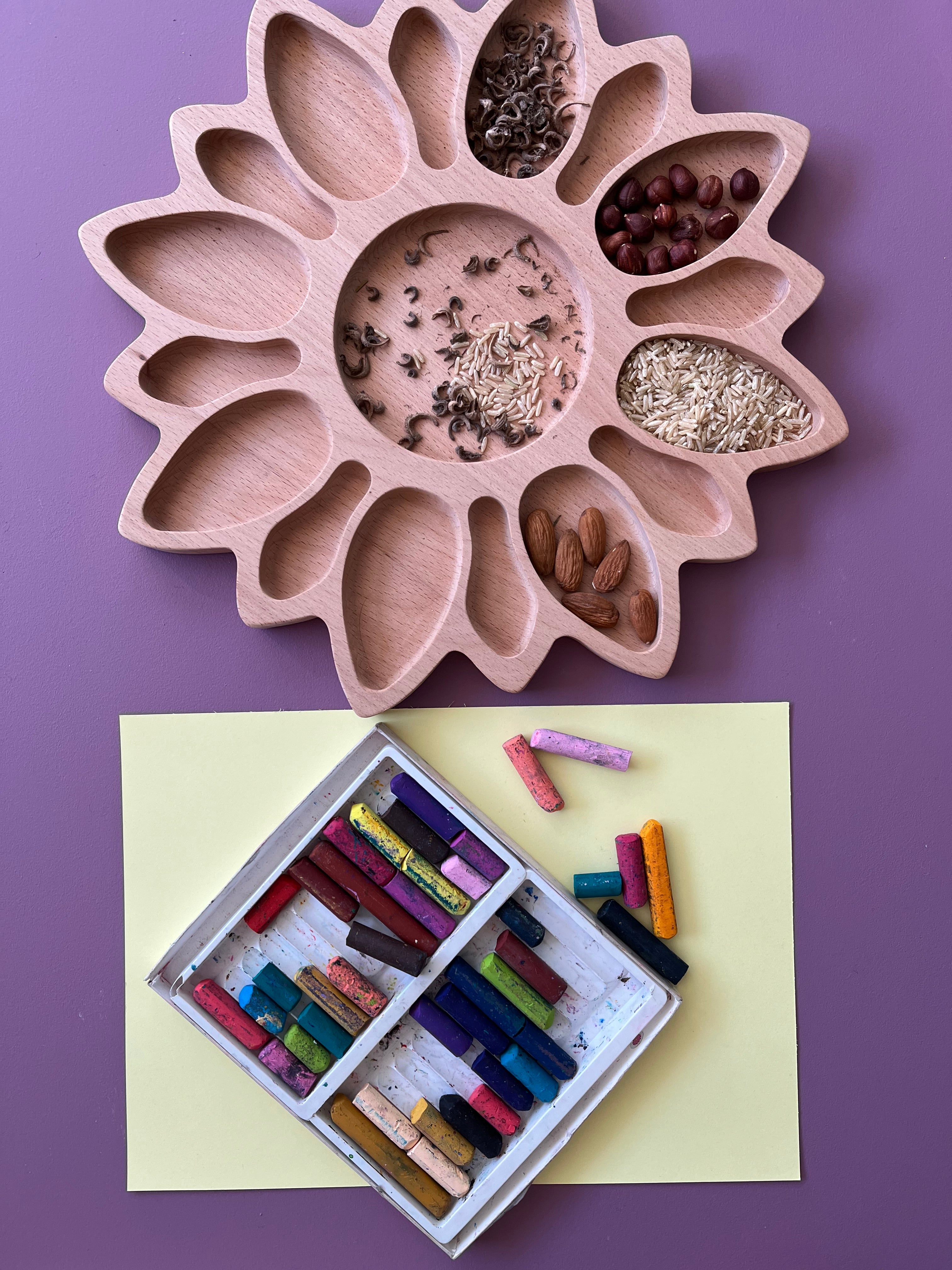 The materials are intended to attract curious children. They are often taken from the nature around us. Shells, pine cones, sticks and stones, anything that tempts a small child's hand is included in the learning process.