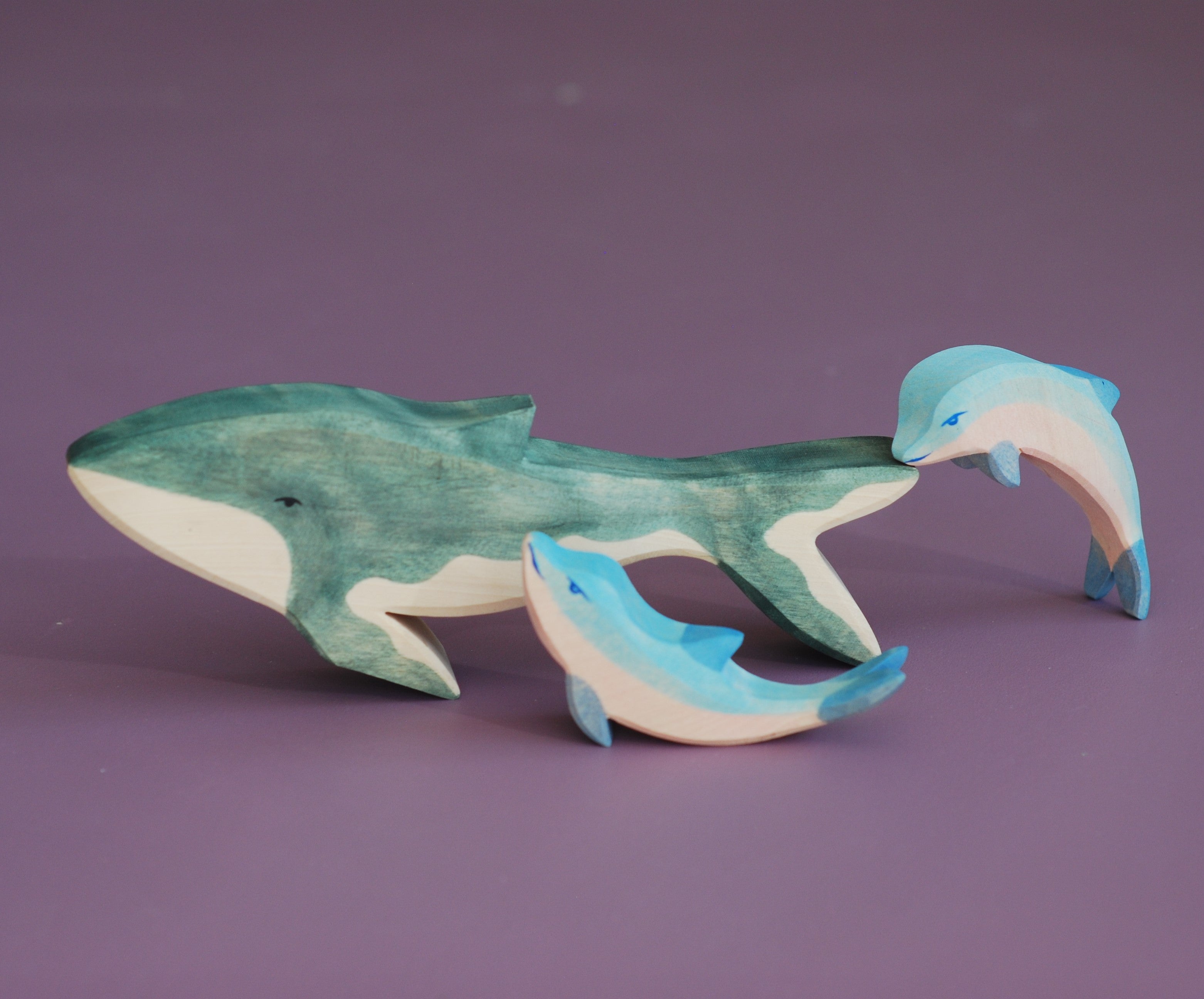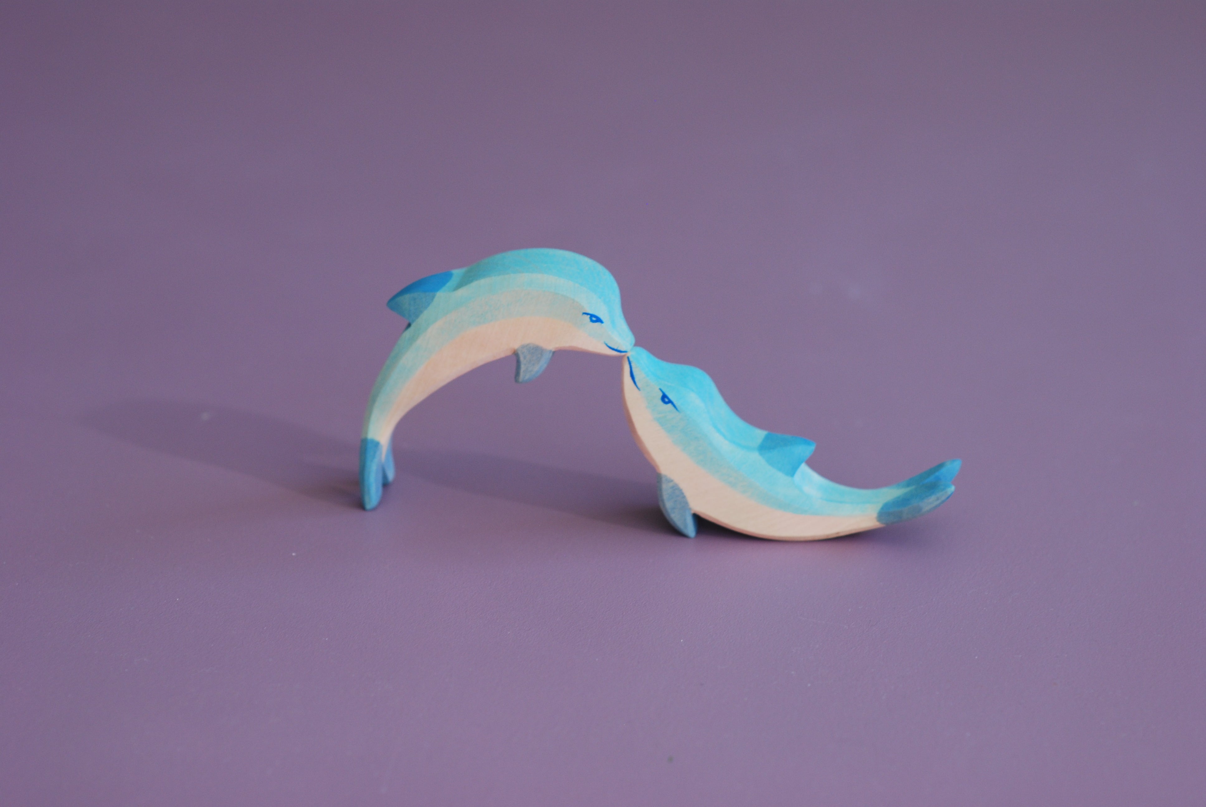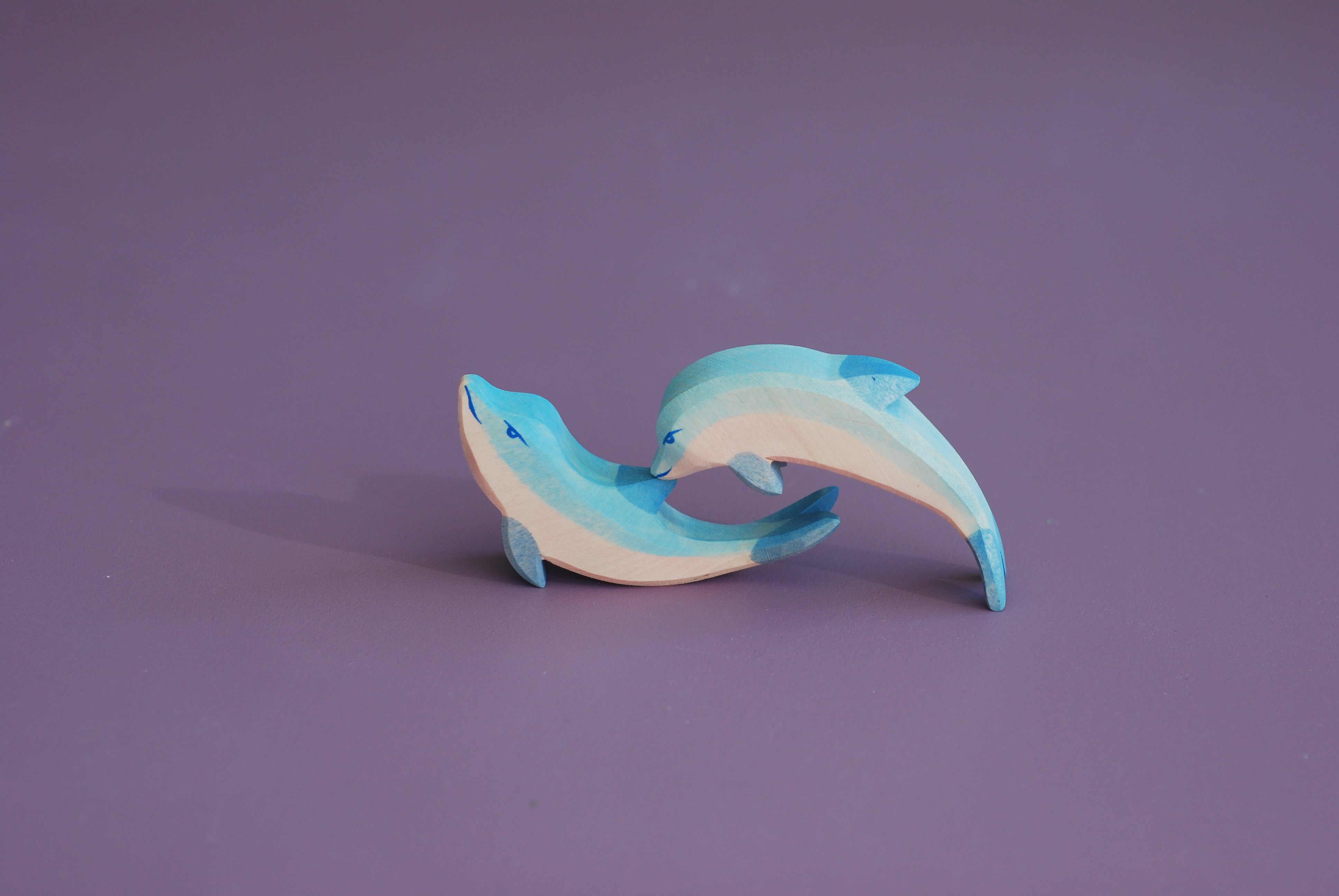 2 wooden playful dolphins. They are carved and painted by hand, making each figure unique. A perfect gift that decorates the surroundings and stimulates the imagination.